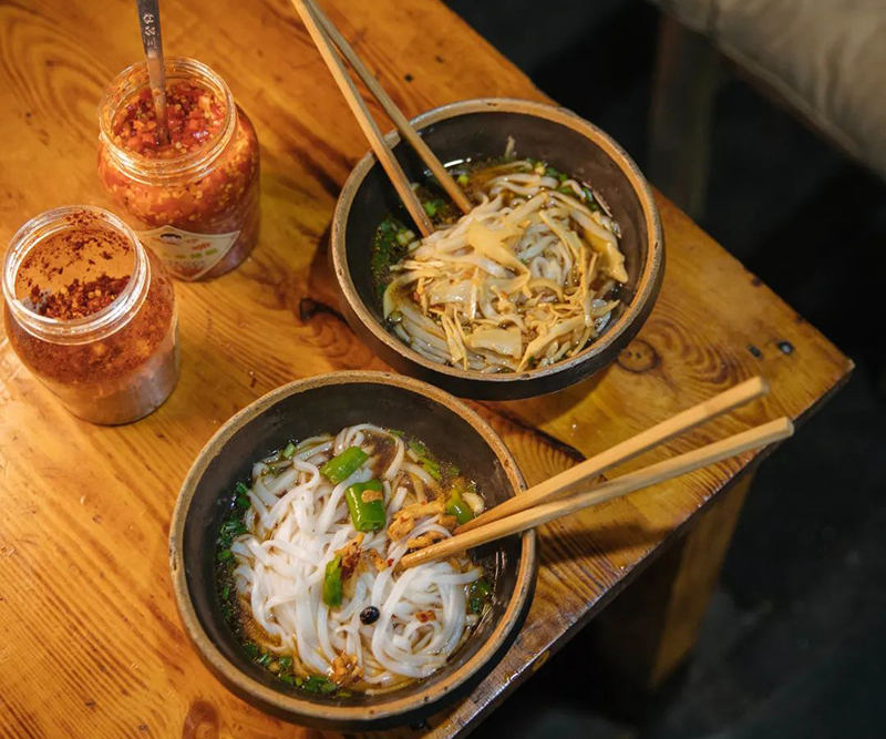 犹豫再三,杨鹏辞了工作回家。他能说会道,生意更好了。店里的招牌是小钵子甜酒,发酵好的糯米粒颗颗分明饱满,冰镇过的尤其清爽,舀上一口,满嘴的清甜酒香。我们那天走了太多路,汗都要出来了,一碗下去,整个人都静下来了。店里也会做甜酒冲蛋。甜酒煮开放上桂圆,冲进蛋液里,喝起来温热开胃,暖意融融,配上葱油粑粑和油条,就是一道最具有市井韵味的早餐。