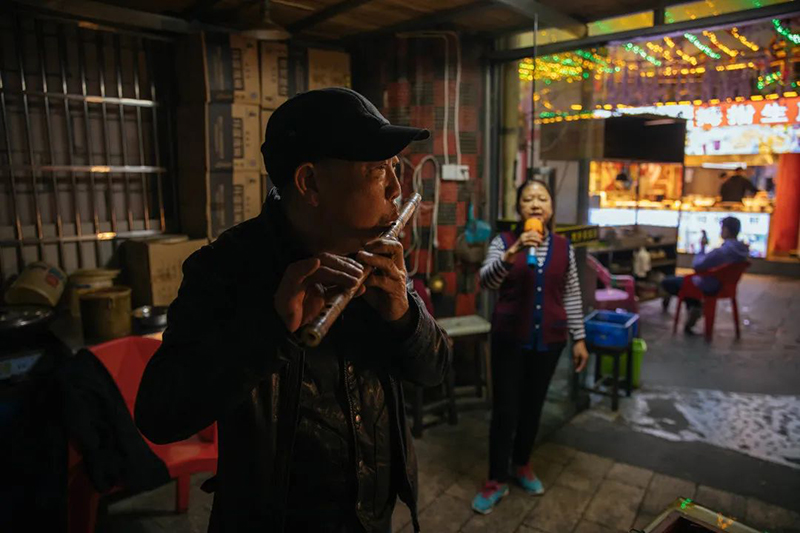 闲暇时,武爹的老婆会在店里唱歌,用的是一架古老的电唱机,武爹会吹笛给她伴奏。我们去的那段时间,武爹刚生了一场大病,气不足,两人许久没有合作过。那天,像是为了欢迎我们,老婆唱起了“天边”:我要跨上骏马,去追逐遥远的星星;天边有一棵大树那是我心中的绿荫……歌声清亮,传遍了整个坡子街。过了一会儿,武爹也拿出了笛子,悠扬的笛声响起时,我突然有些鼻子发酸。受疫情的影响,整个坡子街美食广场没有食客,只有表演的他们,以及蔡小川我们两位看客。
