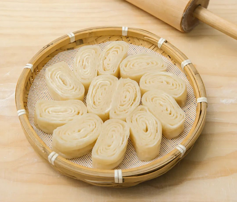 知道脑髓卷是在饭店渔香庭院的桌子上。菜刚上桌,服务员就端来一个小筐,里面摆着肉饼、南瓜饼等,还点缀着几节甘蔗。脑髓卷在其中很不起眼,看着像普通的花卷,只是看起来晶莹剔透一些。如果在平时,不爱吃主食的我瞧都不瞧一眼。可那天,我的胃告诉我,它吞了太多辣椒,需要这样一个东西来填补一下。咬了第一口就觉得有些惊讶,软糯糯、甜丝丝,像是米制品,颇为不错。