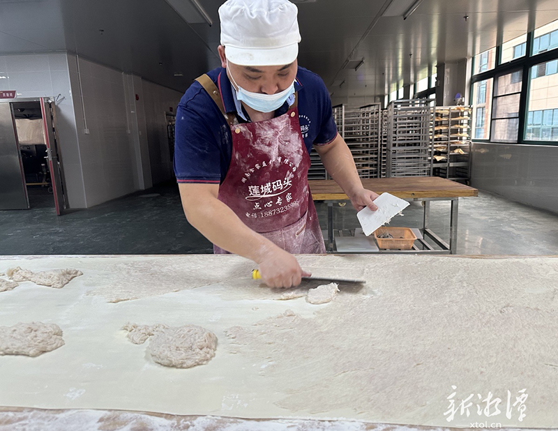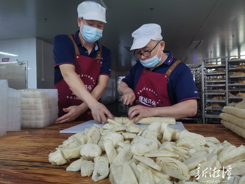 在湘潭县易俗河佳海食品医药产业园的一个厂房里,徐国斌正在制作脑髓卷。擀皮、抹馅、叠面、抽条,动作娴熟利落,一看就是老师傅。